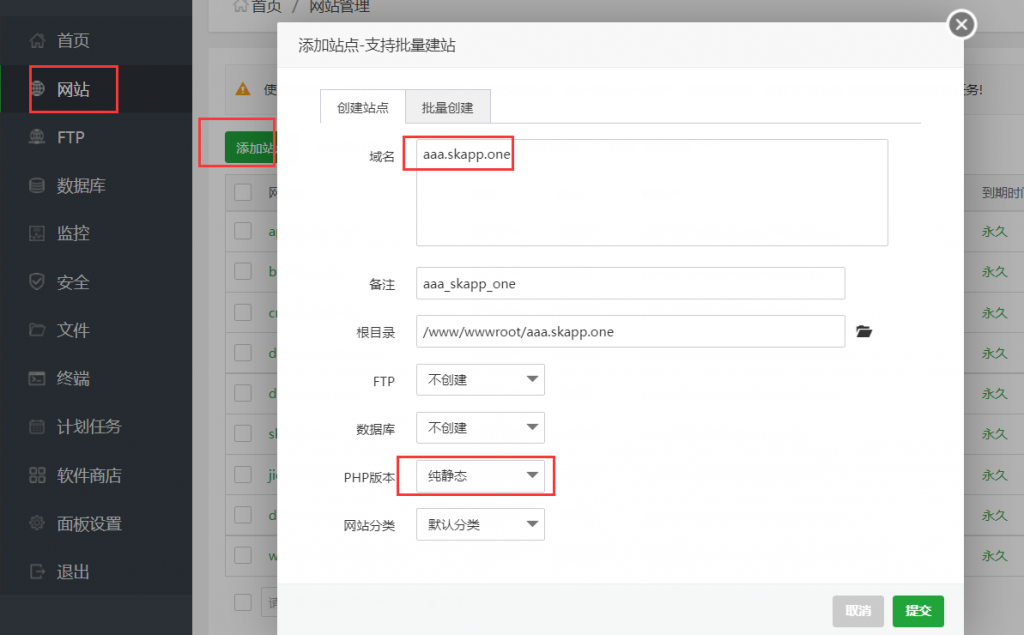 1.在宝塔下添加站点,php版本选择纯静态。